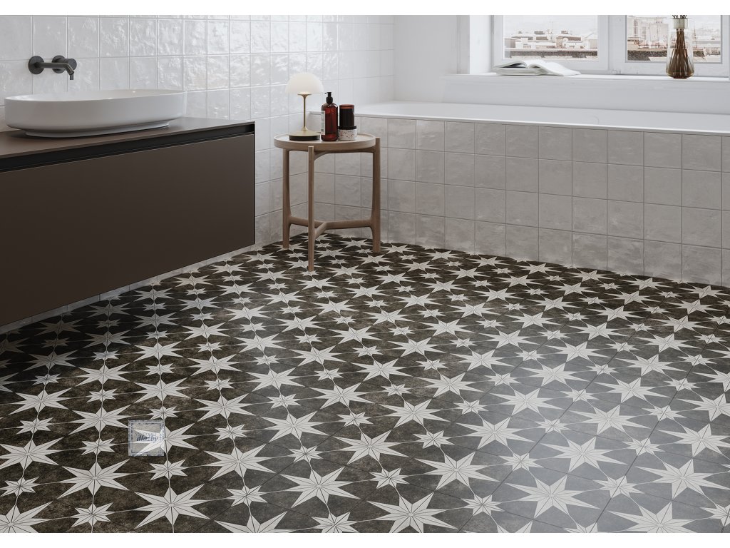 Navarti Precut Star Black 45x45 Matt. jsou dlaždice ze série Navarti Precut od keramičky Navarti ceramica. Tyto dlaždice jsou vhodné jako dlažba do předsíně, do obývacího pokoje, do kuchyně, do koupelny, pro komerční prostory a do interiéru. Střep je mrazuvzdorný slinutý. Dlaždice jsou více-barvé s matným povrchem, styl dlaždic je málo proměnlivý retro a dekorovaný. Jedná se o keramické dlaždice ve formátu 450x450mm a tlouštce 9,5mm.Doplňkové parametry
